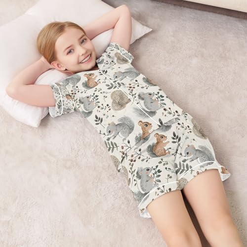 senya Squirrel Eat Leaves Satin Summer Pajama Sets Silk Short Sleeve Button Down Sleepwear 2