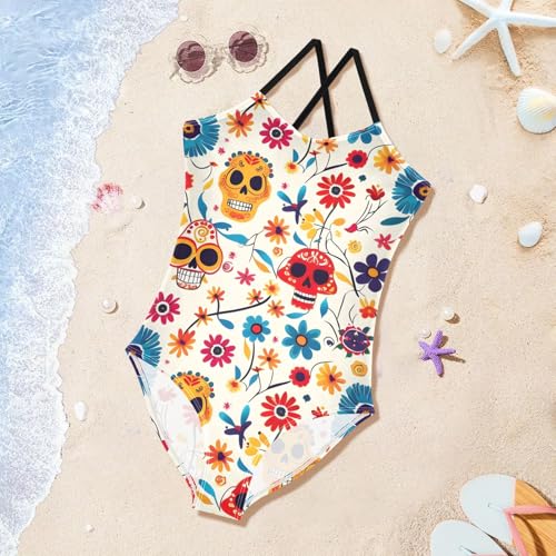 Girls Swimsuit Dia De Los Muertos Pattern One Piece Swimwear 4