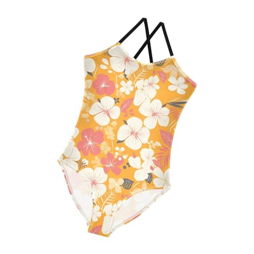 KLL Vintage Yellow Orange Floral Pattern Girls' One Piece Swimsuit Summer Swimming Suits Adjustable Strap Quick-Dry 6