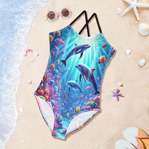 Marine Life Coral Dolphins Girls Swimsuit Bathing Suit Summer Beach Swimwear One Piece Swimsuits 4