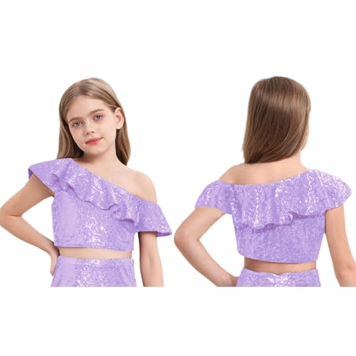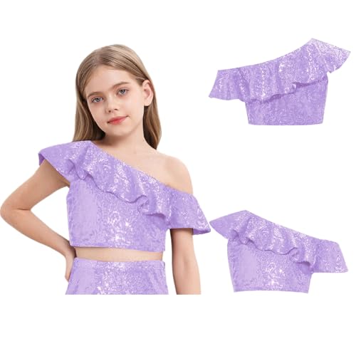 HOT ! renvena Girls Sequin Ruffle Crop Top Sparkly One Shoulder Latin Jazz Modern Dance Cami Tank Tops