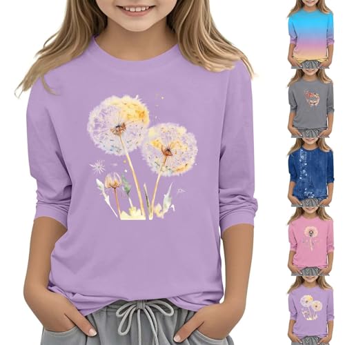 Girls Summer 3/4 Length Sleeve Tops Crew Neck Shirt Casual Floral Graphic Tee Toddler Soft Loose Fit Blouse Kids Clothes 5