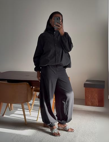 • Chic Design: The oversized zip up bomber jacket features a buttoned high collar, raglan sleeves, contrast black buttons and concealed zip closure with adjustable drawstring hem for a customized, fashion-forward silhouette