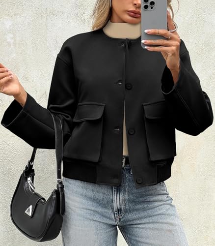 HOT ! Tankaneo Womens Cropped Bomber Jackets Casual Button Down Collarless Shackets Crewneck Loose Fit Coat