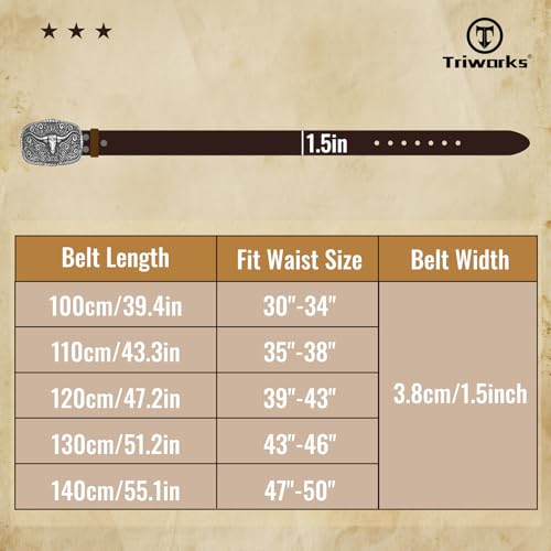• Size and color: This men western embossed leather belt offers four sizes ranging from 30”to 50”, capable of meeting the needs of most people. A punch tool is provided in case you need to add more holes. The belt is 1.5”wide and can easily pass through pant loops. The classic black, brown, and coffee belt straps can be worn with different outfits.