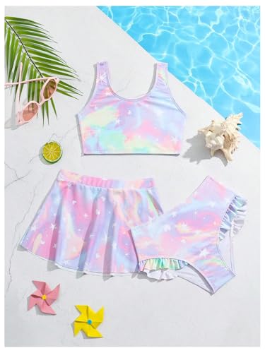 SweatyRocks Girl's 3 Piece Swimsuit Tie Dye Graphic Ruffle Bathing Suit with Beach Coverup Skirts 4