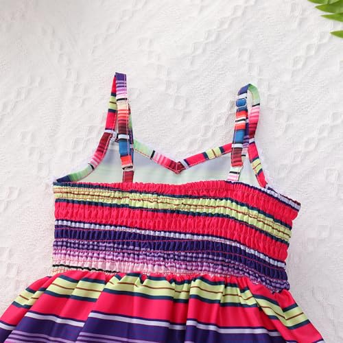 • Mexican Fiesta Dress Design: Mexican traditional folk V neck ruffle dress sundress, adjustable spaghetti straps, elastic shirred back, the length can be adjusted flexibly as needed. Full printed with multi-colored gradient stripes, the dress add a striking and eye-catch touch, which stands for a traditional Mexican style. Great for fiesta party outfit girl one year old birthday, Mexican birthday tutu dress for girl, tropical beach party, summer holiday clothes etc;