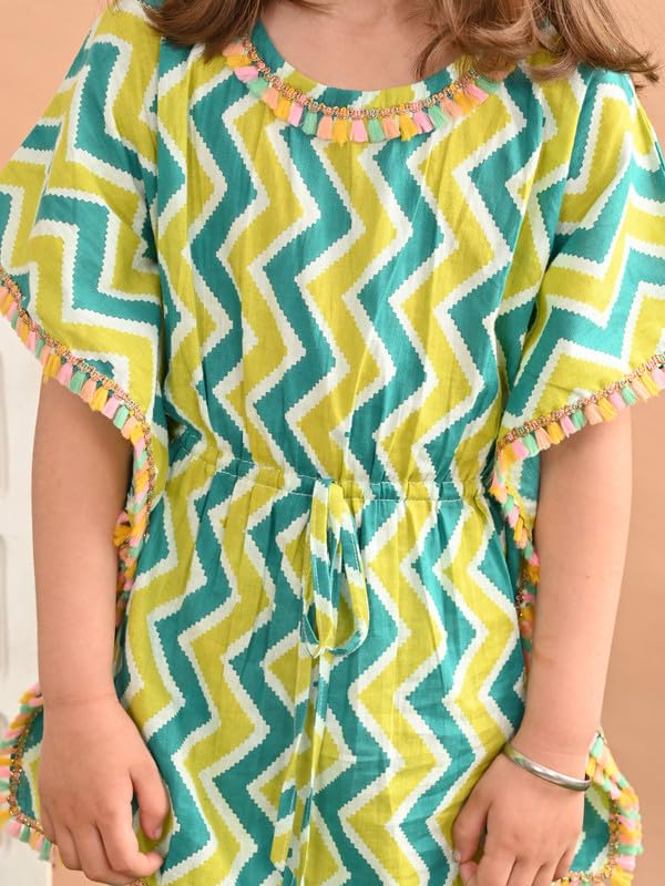 Baby Girls Cotton Zig Zag Printed Drawstring Waistband Kaftan With Fringe Style Golden Lace and Matching Pants 4