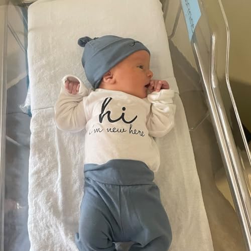 • DESIGN:Cute baby boy clothes, short sleeve romper, basic outfit for baby boys,''hi, I'm new here'' letter print clothes set,newborn infant baby boy 3 pieces suit set, snap closure for easy diaper changing, elastic waistband pants, solid color. With matching top knot hat, classic and generous, newborn 1st outfit, make your little one very cute