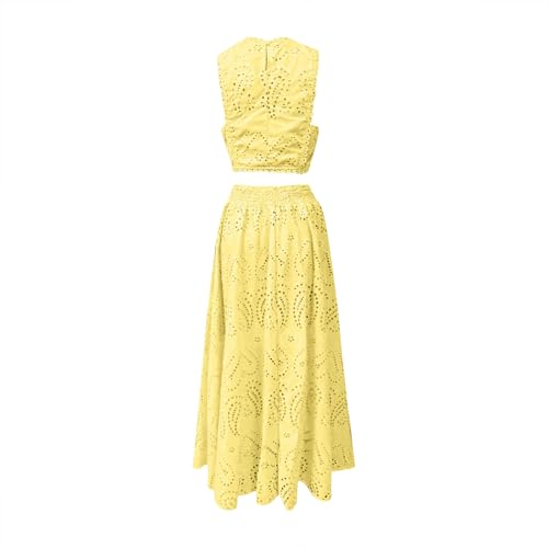 HOT ! HGps8w Womens 2 Piece Outfits Boho Lace Hollow Crop Halter Tank Top with Maxi Skirts Trendy Vacation Sets with Pockets