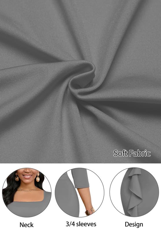 More information about Womens Work Dresses Elegant Square Neck 3/4 Sleeve High Waist Bodycon Ruffle Vintage Church Pencil Midi Dress