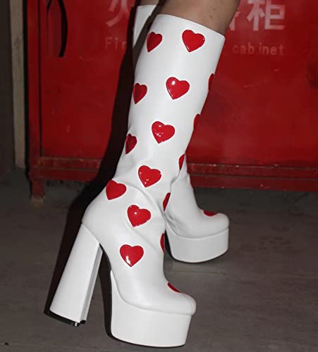Frankie Hsu Women's Large Size Cute White Pu Leather Red Heart Spade Shape Patent Preppy Style Platform Chunky Block Heels Knee High Heeled Boots 5