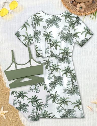 Girls Swimsuit 3 Piece Tropical Print Bikini Set Criss Cross Bathing Suit with Drawstring Quick Dry Cover Up 7-16Y 4
