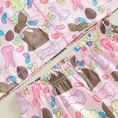 Toddler Baby Girl Easter Day Silk Pajamas Set Feather Trim Button Up Shirts Tops Shorts Pants Bunny Satin 2PCS Pj Set 6