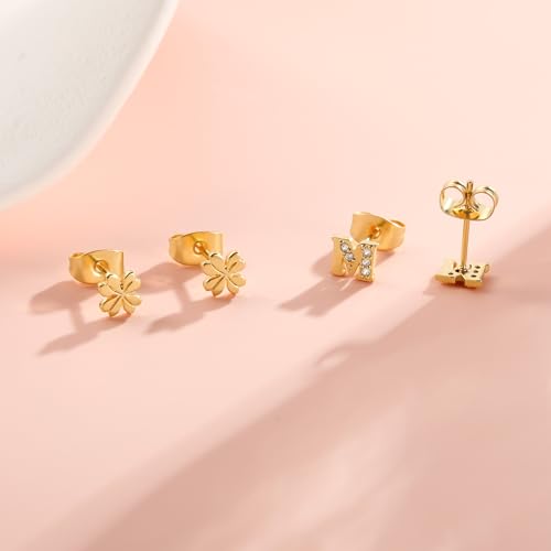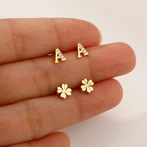 Ritach Initial Stud Earrings for Girls Women - 2 Pairs S925 Sterling Silver Post Lucky Clover Stud Earrings Hypoallergenic Gold Earrings Set Cartilage Initial Earrings for Girls Kids Teen Girl Gifts 6