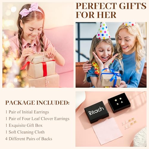 HOT ! Ritach Initial Stud Earrings for Girls Women - 2 Pairs S925 Sterling Silver Post Lucky Clover Stud Earrings Hypoallergenic Gold Earrings Set Cartilage Initial Earrings for Girls Kids Teen Girl Gifts